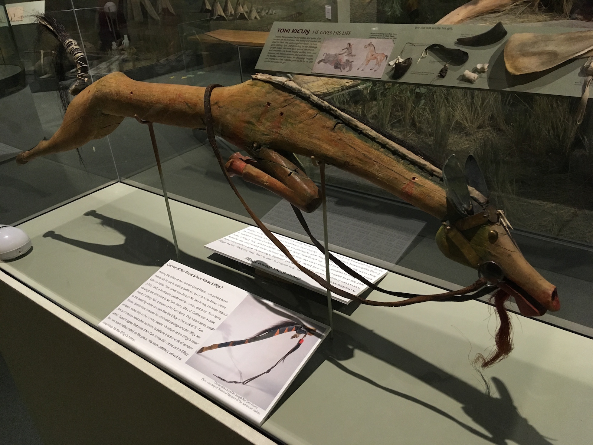 Bei der Sioux Horse Effigy handelt es sich um eines von nur zwei erhaltenen Holzskulpturen, die ein ganzes Pferd zeigen. Ein Lakota-Sioux soll das Stück als Erinnerung an sein im Kampf gefallenes Pferd um 1875 geschaffen haben. Es gibt noch weitere „Horse Dance Sticks“ im Museum, die den hohen Stellenwert des Pferdes bei den Sioux-Indianern belegen. Das berühmte Pferdebildnis bildet das Zentrum der ersten der drei Abteilungen. Die Halle mit dem Titel Oyate Tawicoh’an – The Ways of the People ist aber nicht nur den Sioux-Indianern gewidmet, sondern wurde auch von Vertreter der drei Untergruppen Dakota, Nakota und Lakota mitgestaltet.