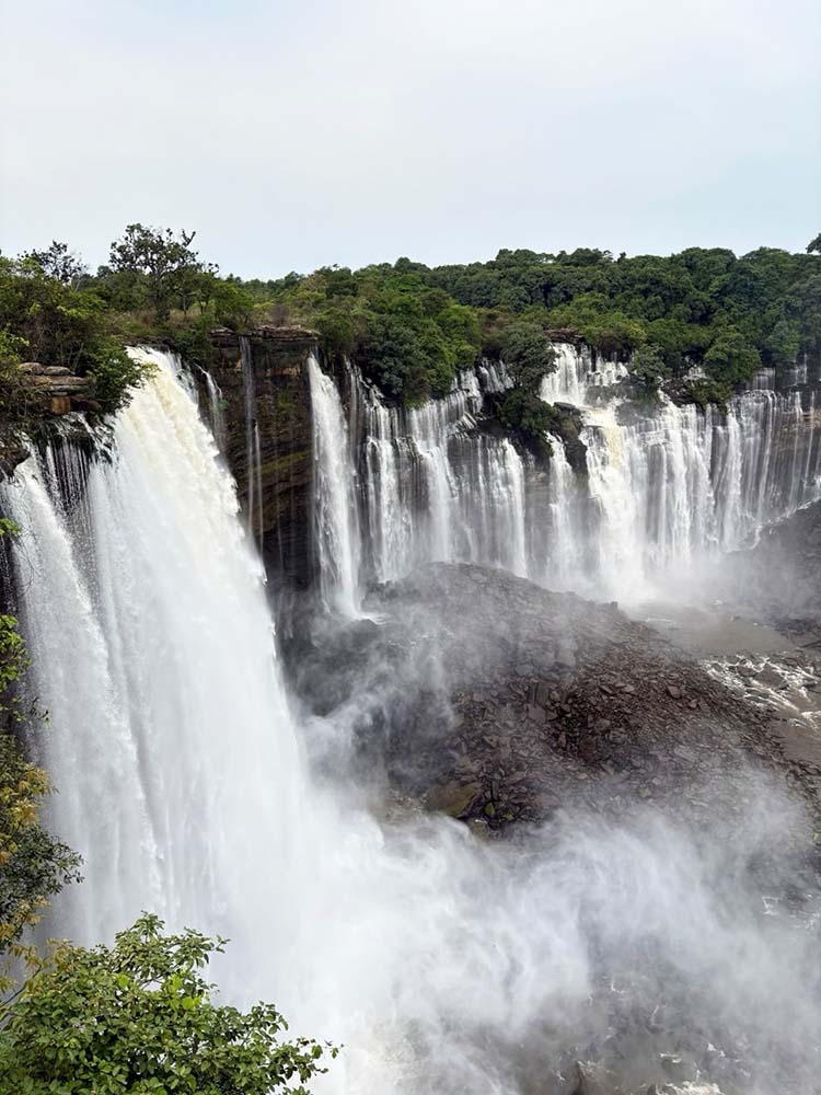 Schon vor dem Erreichen der Kalandula-Wasserfälle ist das Rauschen des Wassers hörbar. Vom Aussichtspunkt aus stürzt der Fluss breit und kraftvoll über eine hohe Fallkante in die Tiefe. Feiner Sprühnebel liegt in der Luft und prägt die Umgebung. Die Wasserfälle sind die zweigrößten in Afrika, aber nicht so populär wie die Viktoriafälle.