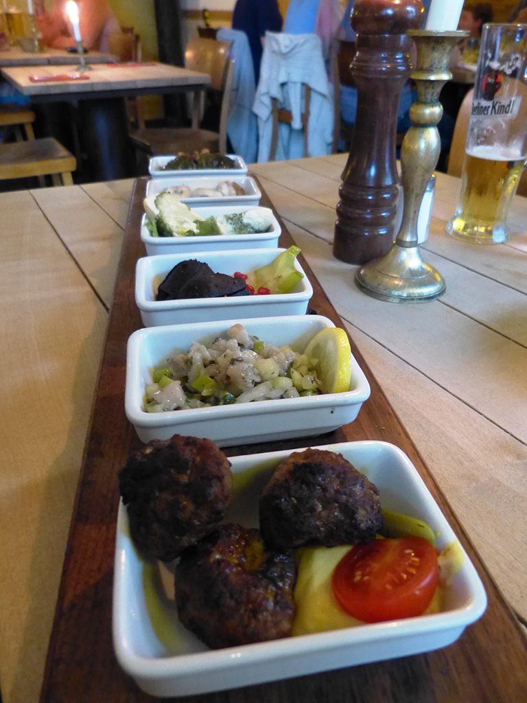 P1090638Sensationell sind die deutsch-österreichischen Tapas, auf einem langen Brett serviert. Bodenständigkeit wird hier modern interpretiert: z.B. kosten 6 Schälchen, gut für 2 Personen, nur 11 Euro. Man wählt u.a. kleine Kalbfleischbouletten, Königsberger Klopse, Forellenmousse, gebackener Broccoli, gehackter Matjes mit Zwiebeln… dazu wird hervorragendes Brot gereicht. Es schmeckt, da alles selbstgemacht ist und nichts aus der Retorte kommt.