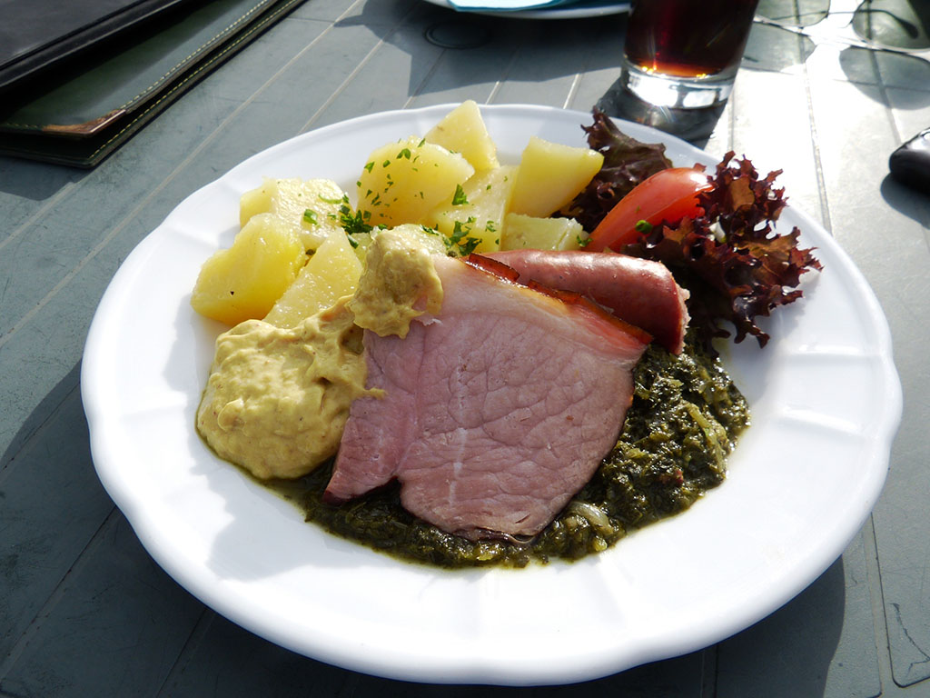 P1110238Auf der Terrasse des Panorama-Restaurants – das Haus dient bereits seit rund 170 Jahren als Gaststätte – kann sich der Besucher an der weiten Landschaft sattsehen. Dabei genießt er eine ehrliche, köstliche Landküche, wobei das Attribut „hausgemacht“ für alles zutrifft. Bodenständigkeit ist angesagt: Ob Grünkohl mit Knacker und Kassler, Königsberger Klopse, Sauerbraten, Gulasch vom Hirsch, aber auch Zanderfilet oder Forellen – alles schmeckt wie bei „Muttern“. Kein Wunder, dass am Wochenende die Gäste aus nah und fern hierher kommen, um gemütliche Stunden zu genießen – und das alles für kleines Geld (Hauptgerichte um 10–14 Euro, z. T. als kleine oder große Portion serviert).