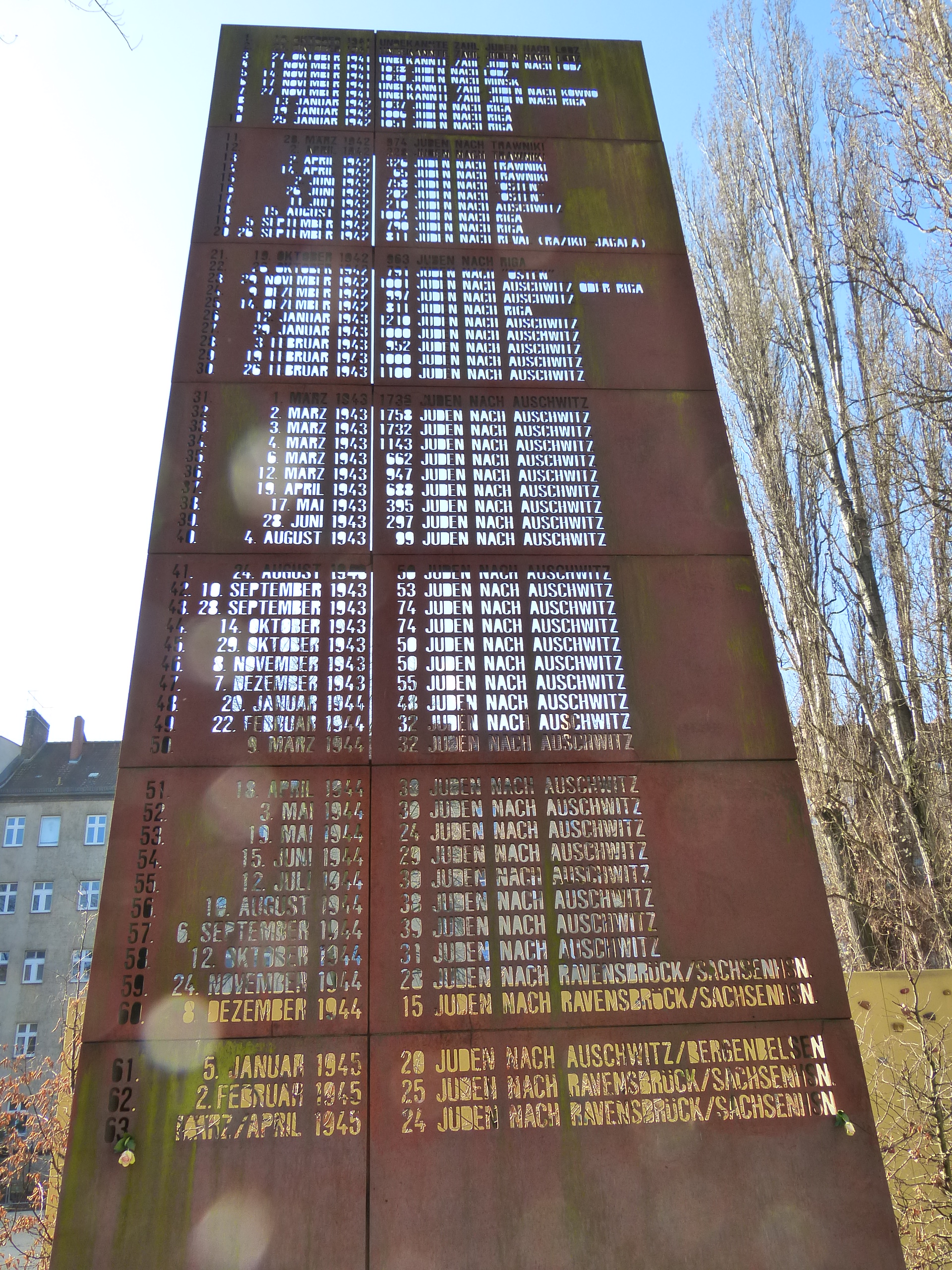 Wie mag es den Menschen damals ergangen sein, die ab Oktober 1941 in die Vernichtungslager im Osten abtransportiert wurden. Vor der Rampe, mit Blick auf Spielplatz und Wohnhäuser, ist eine schräge hohe Eisenplatte aufgerichtet. In sie sind die einzelnen Transporte in die KZs eingestanzt, der Lichtdurchfall erleichtert das Lesen. Ihre Höhe entspricht der der ehemaligen Synagoge. Eine grausame – aber künstlerisch eindrucksvoll gestaltete Dokumentation. Davor, auf dem Weg zur Rampe, sind in eine Betonplatte gusseiserne Reliefs aller 36 Synagogen Berlins eingelassen. Neben dem „Denkmal für die ermordeten Juden Europas“ am Tiergarten und dem „verlassenen Raum“ am Koppenplatz (Berlin-Mitte) ist dieses Mahnmal ein Muss für jeden geschichtsinteressierten Berlin-Besucher.