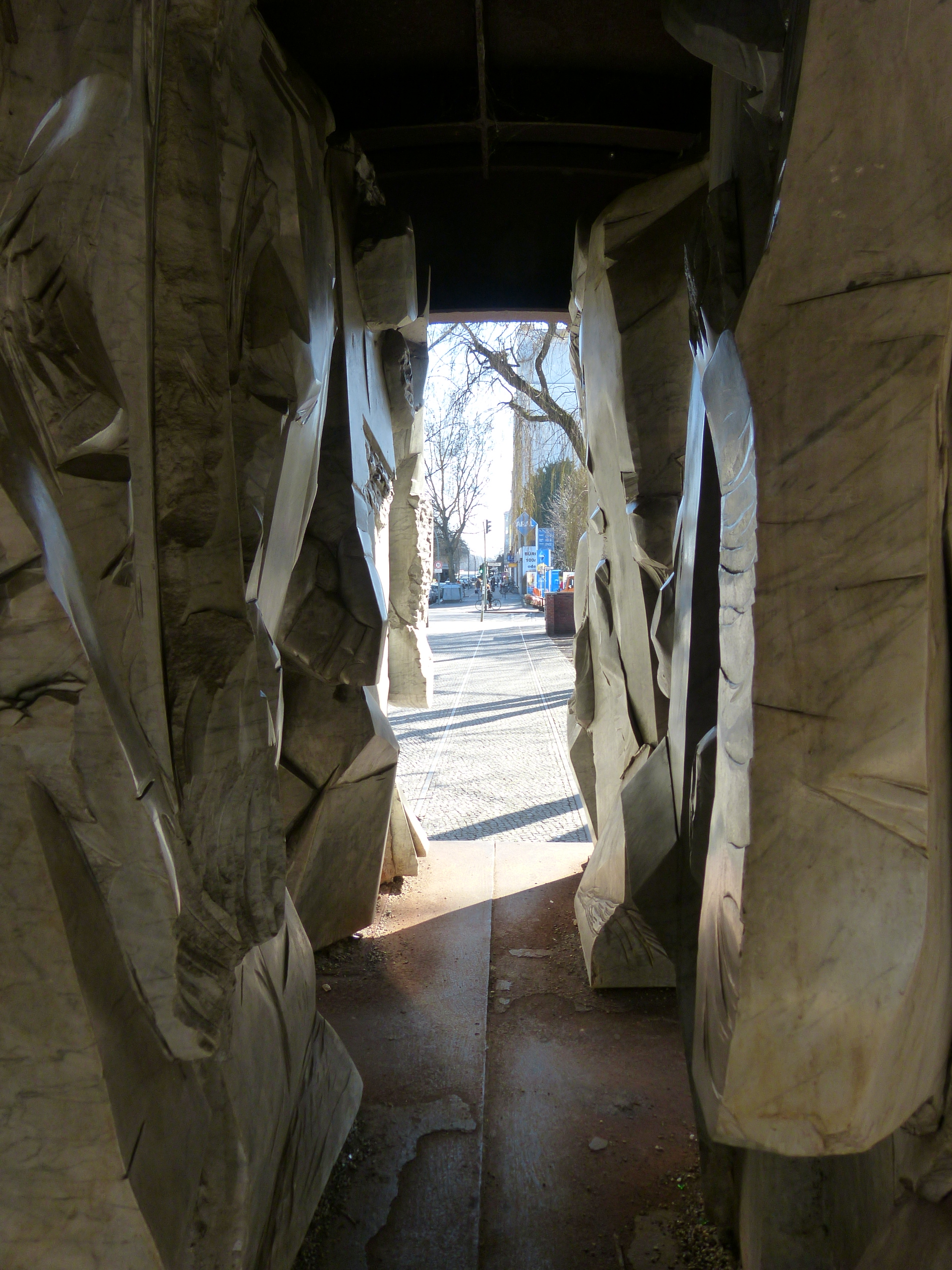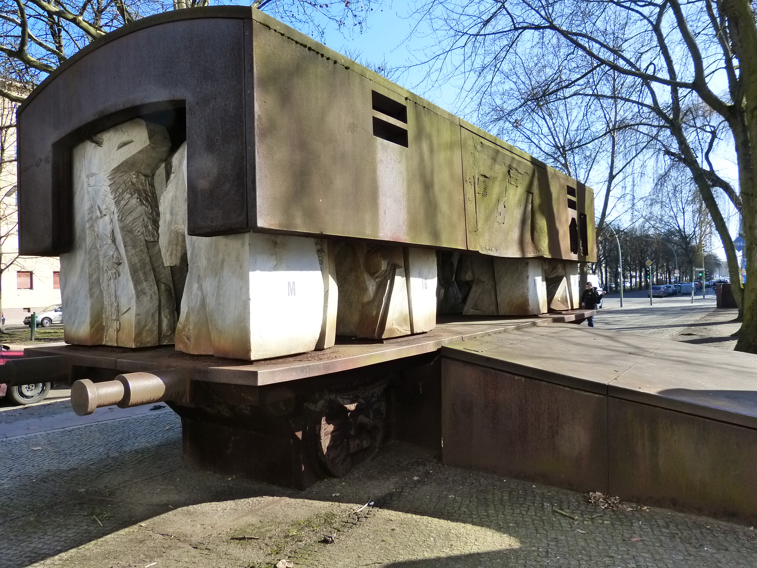 Entlang eines Bürgersteigs steht er, unbeweglich: Ein alter Eisenbahnwagon, drinnen gedrungene, stilisierte, menschenähnliche Gestalten – aus Stein herausgehauen. Man muss sich schon ducken, um über eine Rampe den Wagon zu erreichen und das Innere zu erleben. Ist man einmal drin, so wird man von steinernen Figuren umgeben. Es ist düster, beklemmend, bedrückend. So belastend kann Geschichte sein! Durch die Wagonluken sieht man draußen die Sonne, doch innen ist man eingesperrt. Das alles war lebendiger Alltag vor etwa 70 Jahren, als jüdische Mitbürger aus ihren Wohnungen gezerrt wurden, um in Konzentrationslager verschleppt zu werden, für die allermeisten das sichere Ende.