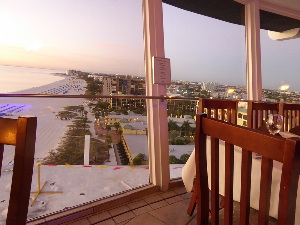 Adresse: Spinners Rooftop Revolving Bistro and Lounge im Grand Plaza Hotel & Beachfront Resort, 5250 Gulf Boulevard, St. Petersburg Beach, Florida 33706, http://www.grandplazaflorida.com/dining/spinners, Tel. 737 360 1811, geöffnet täglich 11–16 Uhr für Lunch, 16 –23 Uhr für Dinner
