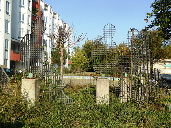 Der Ursprung dieses städtischen Kleinods reicht zurück in die Zeit vor der Wiedervereinigung. Hier – kurz vor der Mauer – legte man in der damaligen Sackgasse den kleinen Straßenpark an. Nach der Wende wurde die Straße für den Durchgangsverkehr geöffnet, der „Park“ wurde zu einer verkehrsumtosten Insel.