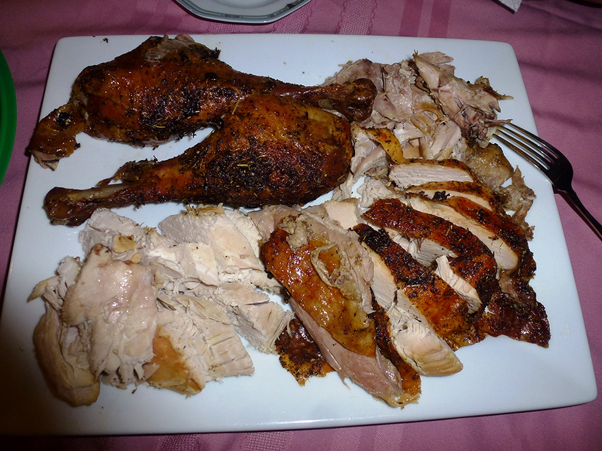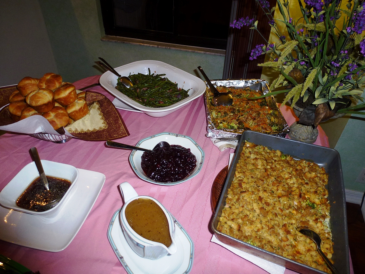 Traditionell wird ein großes opulentes Essen aufgetragen, im Mittelpunkt steht ein gerösteter Riesen-Truthahn von mindestens 20 Pfund. Und dazu gibt es jede Menge Beilagen: Kartoffelstampf, grüne Speckbohnen, Salate, Schinken, Aufläufe verschiedenster Art, Kuchen, Desserts…. ein wahres Gelage.