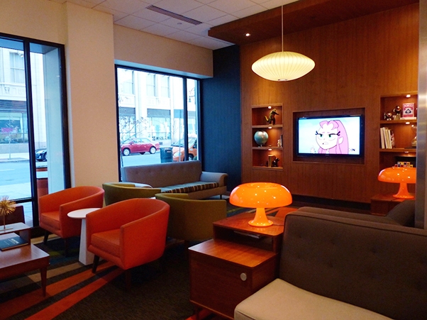 Cartoons an den Wänden begrüßen Gäste im Eingangsbereich, es gibt dort einen 5 & Dime-Shop mit Kleinigkeiten aus der guten alten Zeit, Bonbons und Limos, Kaugummi und Krimskrams. Außerdem liegen Zeichenblöcke zum Herumkritzeln da, gibt es Reiseliteratur zum Schmökern und Spiele zum Ausleihen für Gäste. Die psychedelischen Kunstwerke von George Scheer sind abstrakt-bunt und passen gut zum ständig auf TV-Bildschirm laufenden Cartoon Network.