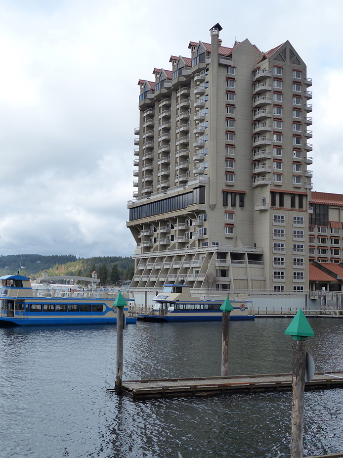 1-CdA-ResortBldgEs ist der höchste Bau im kleinen, netten Städtchen Coeur d’Alene, im Norden des Bundesstaats Idaho, und liegt malerisch direkt am Ufer des gleichnamigen Sees: das Coeur d’Alene Golf & Spa Resort geriet schon mehrfach in die Schlagzeilen, vor allem wegen des gelungenen Golfplatzes mit seinem „Floating Green on the 14th“: Das 14. Loch des Golfplatzes befindet sich auf einer Insel im See.