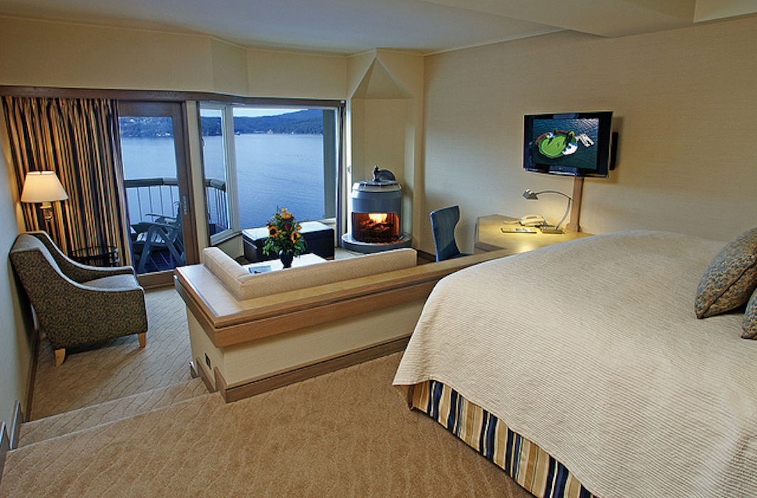 2-CdA-Resort-GolfCourse14thHoleZum Golfen kommen viele Besucher, doch das Hotel hat weit mehr zu bieten. Die mehr als 300 Zimmer verteilen sich auf verschiedene Gebäudeteile. Augenfälligster und modernster Teil ist der 18-stöckige Lake Tower. Dort verfügen alle Gästezimmer über Balkone mit Blick auf den See, die umgebenden dichten Wälder und die Berge. Den Ausblick kann man sogar vom Bett aus genießen, denn die Betten stehen erhöht. Es gibt Gaskamine, große Bäder mit Wanne und Dusche, Sofa und Kaffeemaschine.