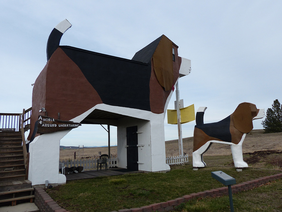 An der kleinen Ortschaft 8-ID-DogBarkParkInnCottonwood würde man wahrscheinlich vorbeifahren, wären dort nicht zwei ungewöhnliche Attraktionen: Einerseits das Dog Bark Park Inn (http://www.dogbarkparkinn.com/), eine kurioses Bed & Breakfast untergebracht in einem riesigen Holz-Hund. Dennis, der Hundefiguren verschiedener Rassen und Größen sägt, und seine Frau Francis, betreiben das Inn und einen kleinen Shop, in dem die Kunstwerke angeboten werden.