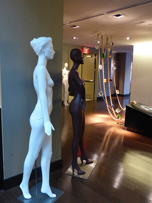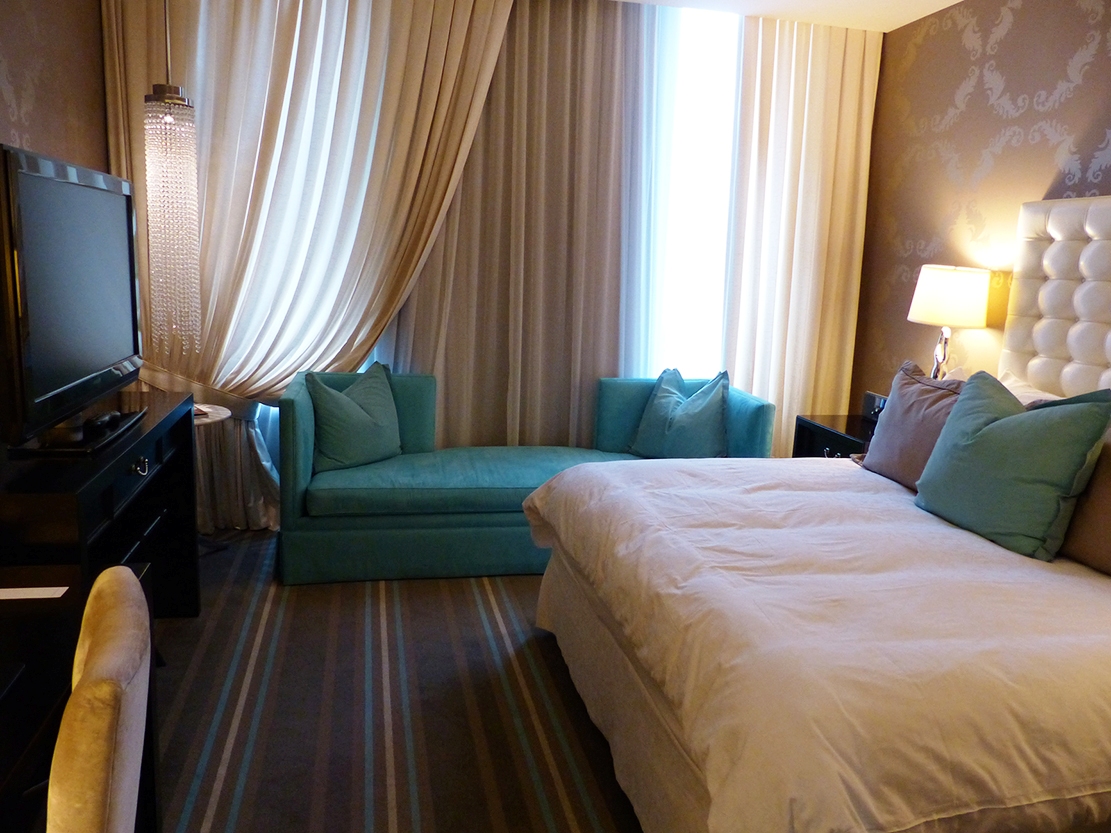 Nostalgisch-modern, artsy & funky, eklektisch und ein bisschen schräg, so könnte man die Innengestaltung des Hotels von Forrest Perkins bezeichnen. Überall im Hotel finden sich moderne Gemälde, Skulpturen und Installationen von lokalen Künstlern und die Materialien, Formen und Farben sind gewagt. In den Hotelgängen, die zu den Gästezimmern führen, HotelNinesPortl-Arthängen Kristalllüster, und betritt man den Raum, steht man zunächst in einem tiffany-türkisblauen Eingangsbereich (mit Kühl- und Kleiderschrank). Hochherrschaftlich wirkt das Bett mit seinem elfenbeinfarbenen Leder-Kopfteil vor latte-farbenen Tapeten, dazu eine Kristall-Hängelampe und Nachttischlampen mit art-déco-artig geschwungenem Metallfuß. Die silbernen Griffe an den dunklen Holzmöbeln gleichen einer Perlenkette. Elfenbeinfarbene Vorhänge in dramatischer Drapierung und davor eine elegante, ebenfalls türkisblaue Recamière mit prallgefüllten Kissen HotelNinesPortl-Roomergänzen das etwas an Ludwig XIV. erinnernde Ambiente. Die Badezimmer sind natürlich ganz aus Marmor mit einem – was sonst? – türkisfarbenen Hocker.
