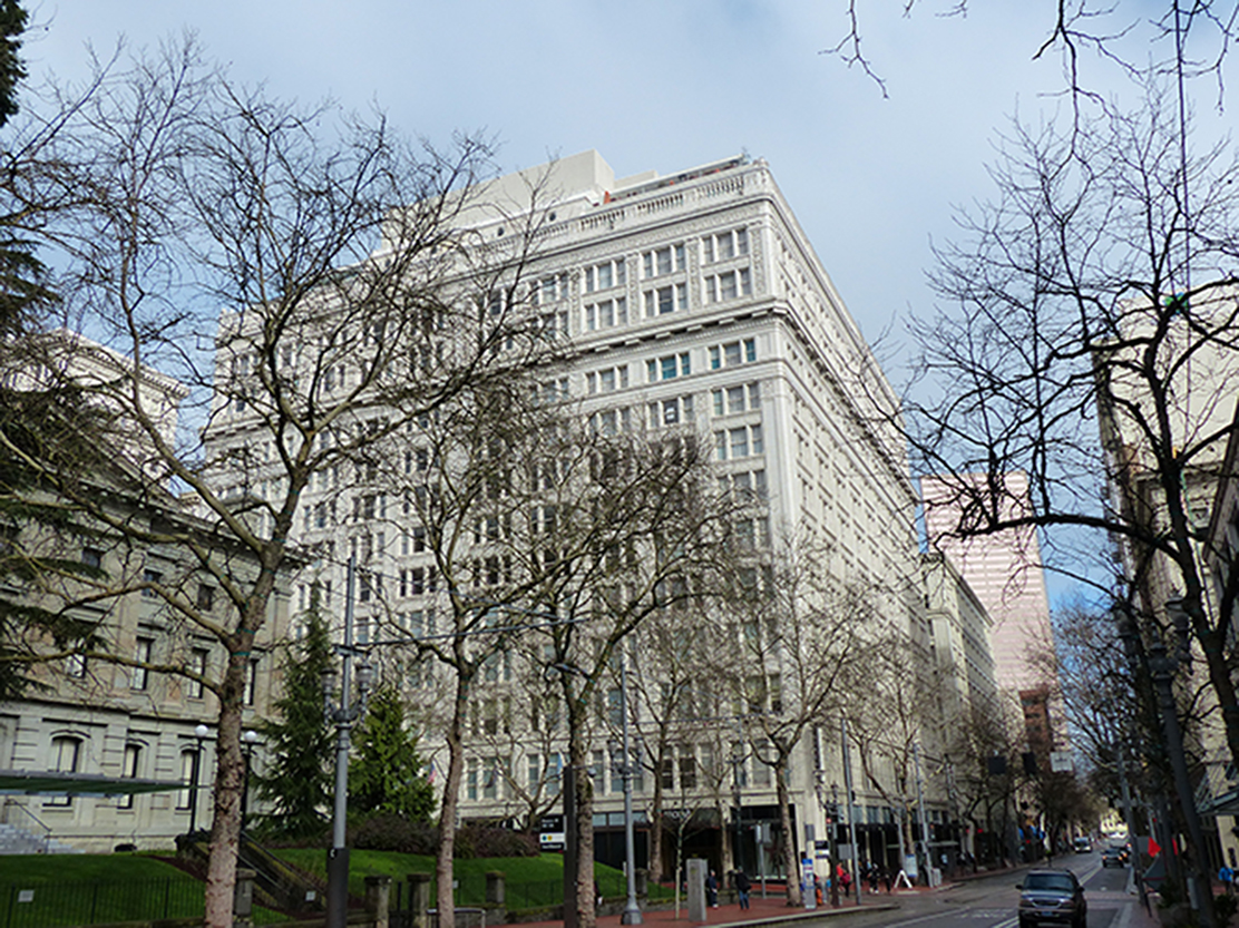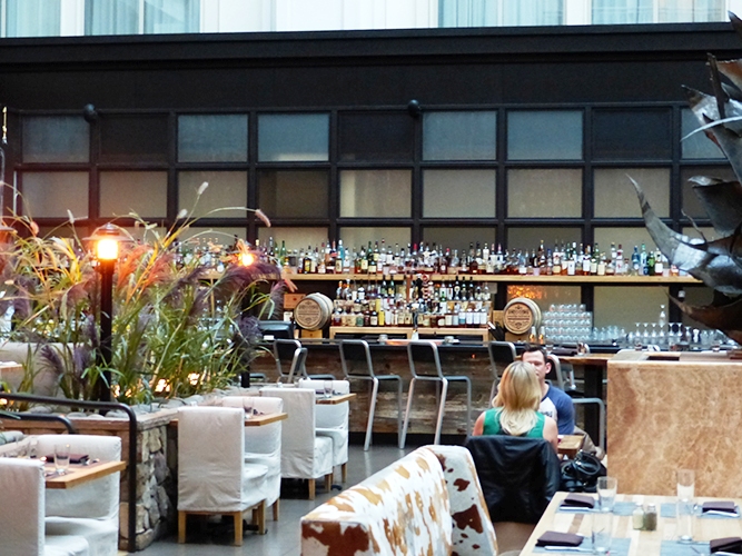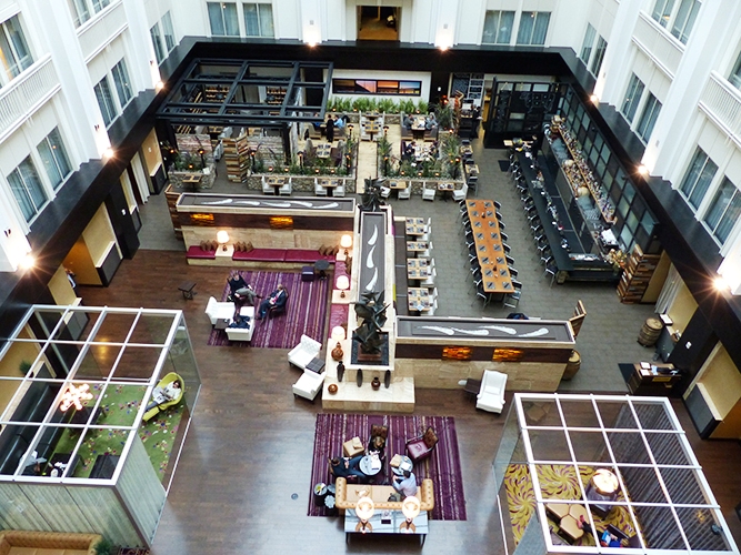 Man sieht auf den ersten Blick das Hotel gar nicht, sondern lediglich einen mächtigen historischen Bau, verkleidet mit weißen Terrakottaplatten. TheNinesPortland-BauEs handelt sich um das Gebäude des ehemaligen Meier & Frank Department Store, ein Kaufhaus, das nicht nur zur Zeit der Erbauung, 1909, über den ersten Aufzug in Portland verfügte, sondern überdies eine eigene Radiostation unterhielt. SERA Architects haben vor einigen Jahren den prominenten Bau am Pioneer Square – im Herzen von Downtown Portland – neu restauriert und seither nimmt die oberen neun Etagen das Hotel The Nines ein.  HotelNinesPortl-LobbyDie Rezeption befindet sich ungewöhnlicherweise im 8th Floor, aber noch überraschender ist die angrenzende “Lobby”, ein sieben Stock hohes Atrium, um das sich Gästezimmer reihen, ausgestattet mit verschiedenen Sitz-Arealen, Restaurant, Bibliothek und Kunstwerken.