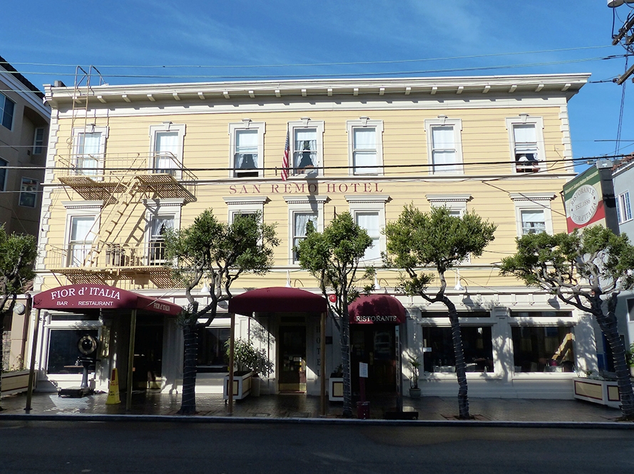 Gleich nach dem verheerenden Erdbeben und Feuer 1906 in San Francisco ließ A.P. Giannini, Gründer der Bank of America, ein neues Hotel in der Mason Street bauen. Er nannte seine Herberge mit 62 Zimmern “New California Hotel” und setzte damit ein Zeichen für den Wiederaufbau der Stadt. Arbeiter, vor allem italienische Immigranten, die am Aufbau der Stadt beteiligt waren, dazu Seeleute, aSF-SanRemo-Bldg Kopieber auch Intellektuelle und Künstler, gingen in dem Hotel mit Restaurant ein und aus. 1922 wurde das Hotel umbenannt in „San Remo“ nach der italienischen Stadt und zur Zeit der Depression wurden im Restaurant Mahlzeiten für 50 Cent serviert. Das Hotel entwickelte sich zur Institution in North Beach.