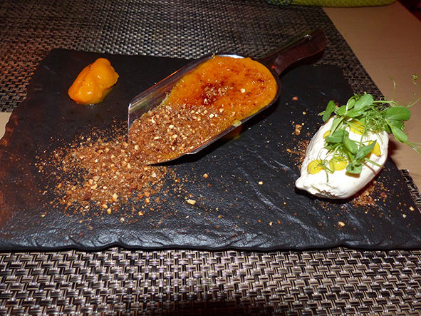 Chefkoch Gabriel Israel, gerade 25 Jahre alt und in Tel Aviv (und Süd-Frankreich) aufgewachsen, stand schon als Kind mit dem Großvater bzw. später mit dem Vater in der Küche. In New York lernte er unter anderem in „Boulud Sud“, einem Restaurant des berühmten Starkochs Daniel Boulud. Dort erhielt er den Spitznamen „Shuka“ – 2-greenfigny-dessert-fotombrinkenach seiner speziellen Shakshuka-Version (einem Gericht aus Tomaten und Paprika mit pochierten Eiern) und rief einen Foodtruck gleichen Namens ins Leben. Gabriel ist nicht nur Koch, sondern, wie seine Arme zeigen, auch Graffiti- und Tattookünstler, außerdem ein Genie, was die ansprechende, kunstvolle Präsentation von Gerichten angeht (auf dem Foto ein „Kürbis-Trio“ als Nachtisch).