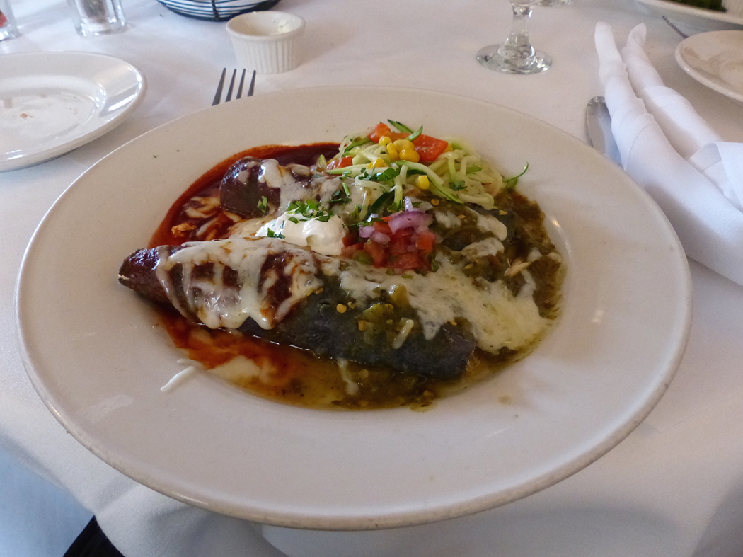 Blue Corn Enchiladas im Santa Cafe in Santa Fe. iwanowski.blogDas bunte Völkergemisch der Stadt wirkt sich auch auf die lokale Küche aus. Mexikanisch beeinflusste Gerichte stehen auf vielen Karten, aber auch typisches Westernkost und Barbecue wie im Cowgirl BBQ (cowgirlsantafe.com) oder kreative Südwestküche, beispielsweise im Santacafe (www.santacafe.com) – wie die Blue Corn Enchiladas auf dem Foto –, sind zu finden. Die deutschstämmige Judith F. Ebbinghaus betreibt dieses beliebte und traditionelle Lokal seit 1983 in Old Town, im historischen Padre Gellegos House. Ein zweiter Deutscher hat sich ebenfalls in der kulinarischen Szene in Santa Fe einen Namen gemacht: Roland Richter, Der gelernte Koch aus Heilbronn lebt und wirkt seit 25 Jahren in Santa Fe und betreibt mit Joe’s Dining (http://joesdining.com) ein beliebtes Lokal, das sich besonders auf regionale und saisonale Produkte, auch mit deutschem Touch, spezialisiert hat.