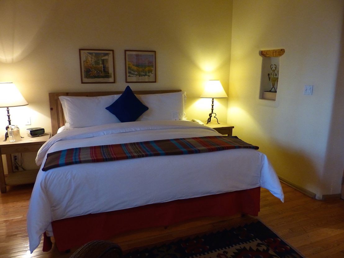 Inn on the Alameda in Santa Fe. iwanowski.blogNur wenige Minuten vom Zentrum entfernt, markiert ein Glockenturm das Inn on the Alameda (www.innonthealameda.com), ein Boutiquehotel, das einem kleinen mexikanischen Dorf im Adobestil gleicht. In der gemütlichen Agoyo Lounge im Hauptbau werden zur Happy Hour am Spätnachmittag Drinks und Häppchen gereicht, Bedroom im Inn on the Alameda. iwanowski.blogmorgens gibt es ein leckeres Frühstücksbüffet – alles im Preis eingeschlossen –, dazu steht eine Gästebibliothek mit offenem Kamin und gemütlichen Sitzgruppen zur Verfügung. Ringsum gruppieren sich unterschiedliche Häuser und Casitas mit Zimmern und Suiten, alle im lokalen Stil und mit Kunstwerken geschmackvoll eingerichtet. Casitas im Inn on the Alameda. iwanowski.blogDas Inn ist ein idealer Standort, um Erholung und Erlebnis – die Erkundung einer spannenden Stadt mit reicher Kunst- und Kulturszene – zu verbinden.