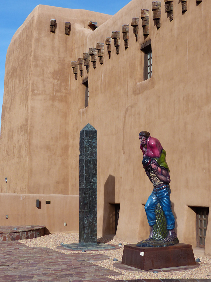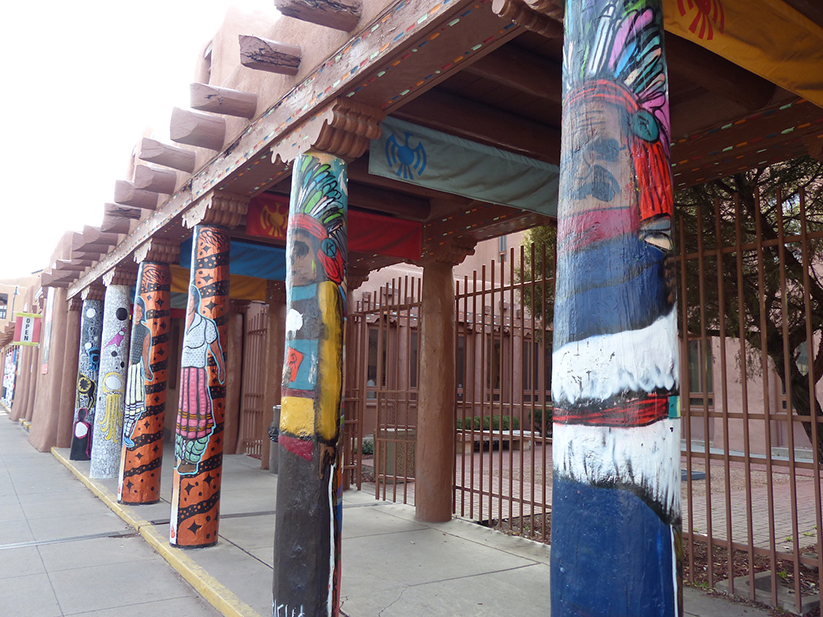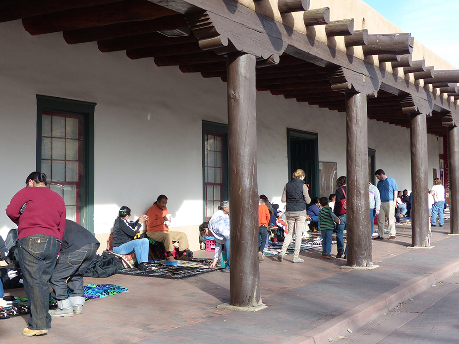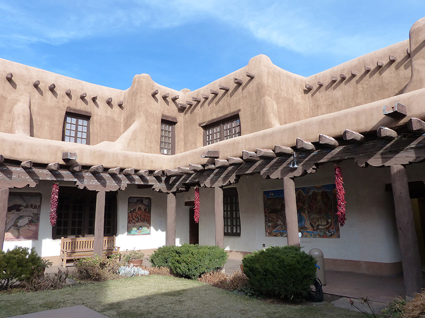 New Mexico History Museum, Santa Fe. iwanowski.blogHäufig der erste Kontakt zu Indianern und deren Kunst erfolgt auf der Veranda des an der zentralen Plaza gelegenen Palace of the Governors. Auf Decken ausgebreitet, bieten Pueblo- und Navajo-Indianer vor allem schönen Schmuck an. Ein Gremium überwacht Qualität und Originalität der Produkte, die die indianischen Künstler hier verkaufen. Der beeindruckende Gouverneurspalast selbst wurde 1610 erbaut und dient heute als sehenswertes Gallerie in Sana Fe. iwanowski.blogNew Mexico History Museum (www.nmhistorymuseum.org) mit schönem Innenhof und modernem Anbau.