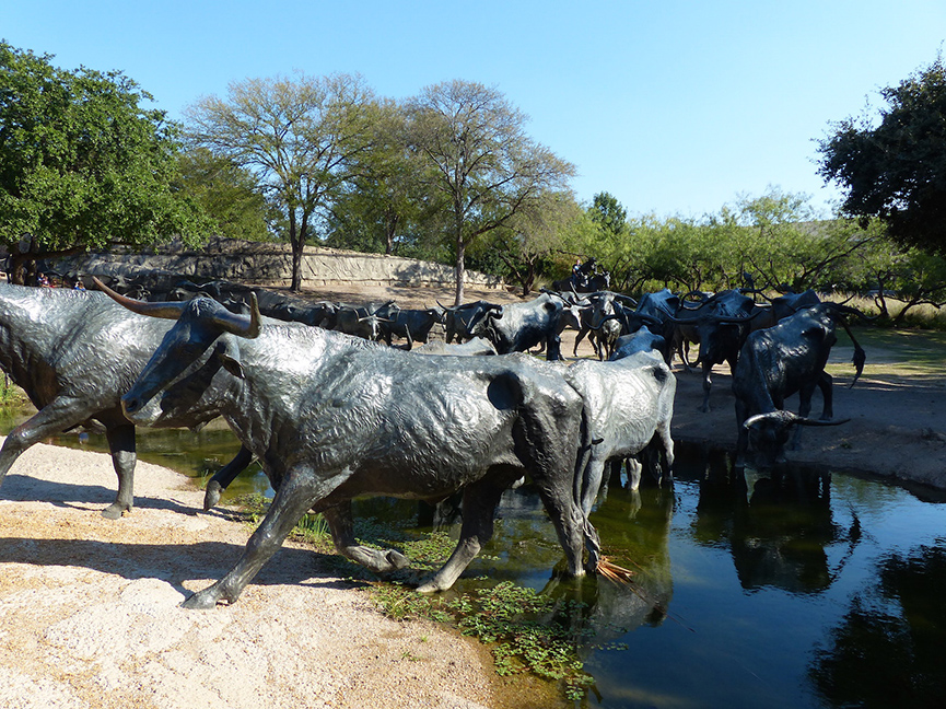 Dallas Convention Center und davor sollte man sich im Pioneer Park unbedingt die Skulpturengruppe „Trail Drive“ ansehen. Dieses beeindruckend echt wirkende Arrangement aus 40 überlebensgroßen Longhorns, die von drei Cowboys durch einen Creek getrieben werden, erinnert an die alten Zeiten der Viehtriebe. Das Werk wurde zwischen 1992 und 1997 von dem texanischen Bildhauer Robert Summers geschaffen.