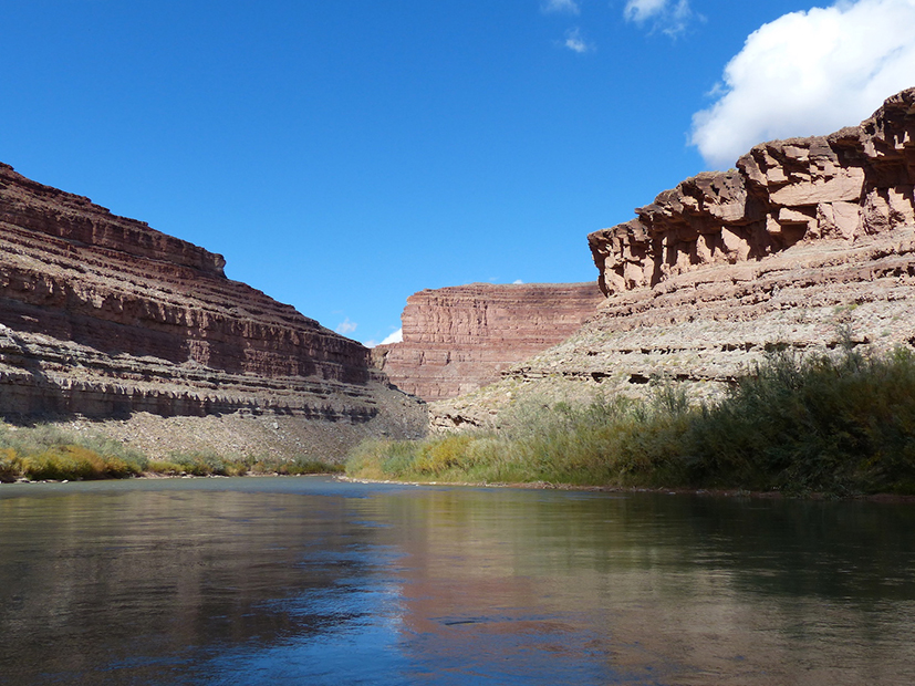 auf dem San Juan River. Hier geht es durch die engen Schluchten, die sich der Fluss in die Felsen gefräst hat und man blickt auf Millionen Jahre Erdgeschichte.