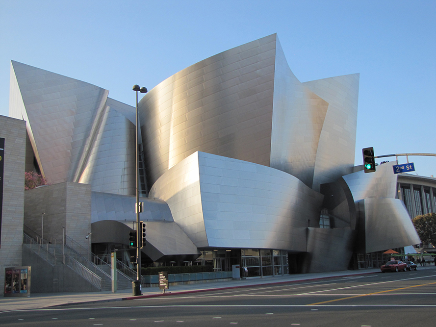 In direkter Nachbarschaft zu der architektonisch auffälligen Disney Concert Hall (2. Foto) von Frank Gehry wurde am 20. September nach etlichen Verzögerungen und Verschiebungen ein neues Museum für zeitgenössische Kunst eröffnet: The BROAD (Titelfoto, 221 S Grand Ave.). Das von dem renommierten New Yorker Architekturbüro Diller Scofidio + Renfro geplante Gebäude fällt vor allem durch seine gespinstartige bzw. einer Bienenwabe gleichende helle Betonfassade auf. Hauptzweck der Konstruktion ist, möglichst viel natürliches UV-gefiltertes Licht ins Innere zu lassen um die Kunstwerke adäquat zu präsentieren.